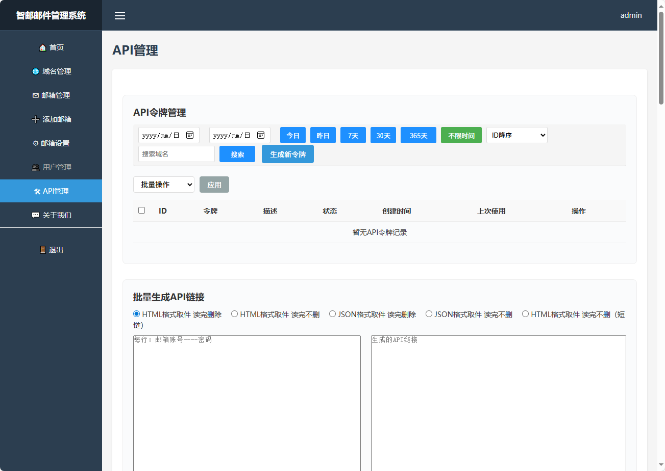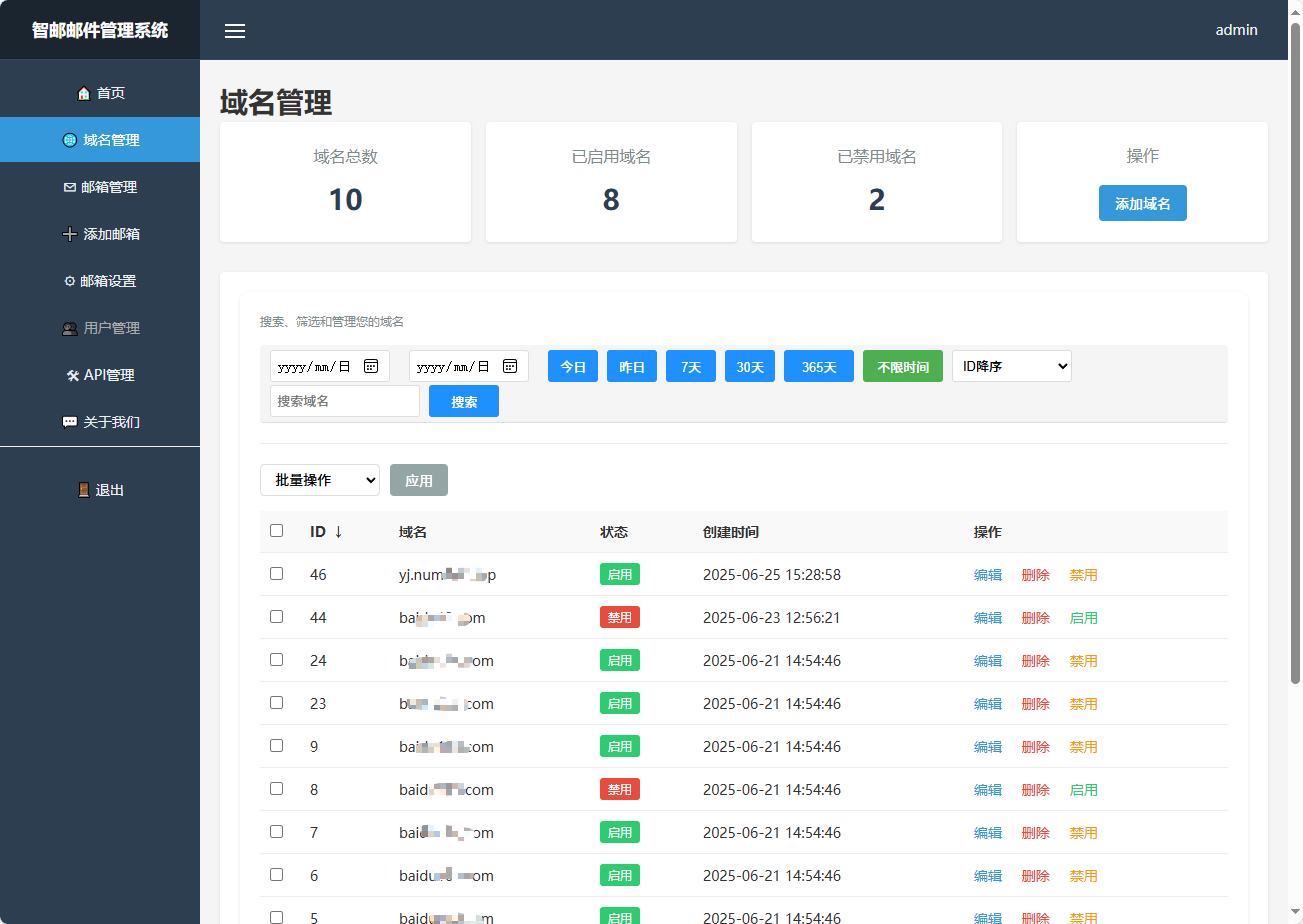 搜索与排序:支持按邮箱、域名等关键词搜索,支持ID排序。