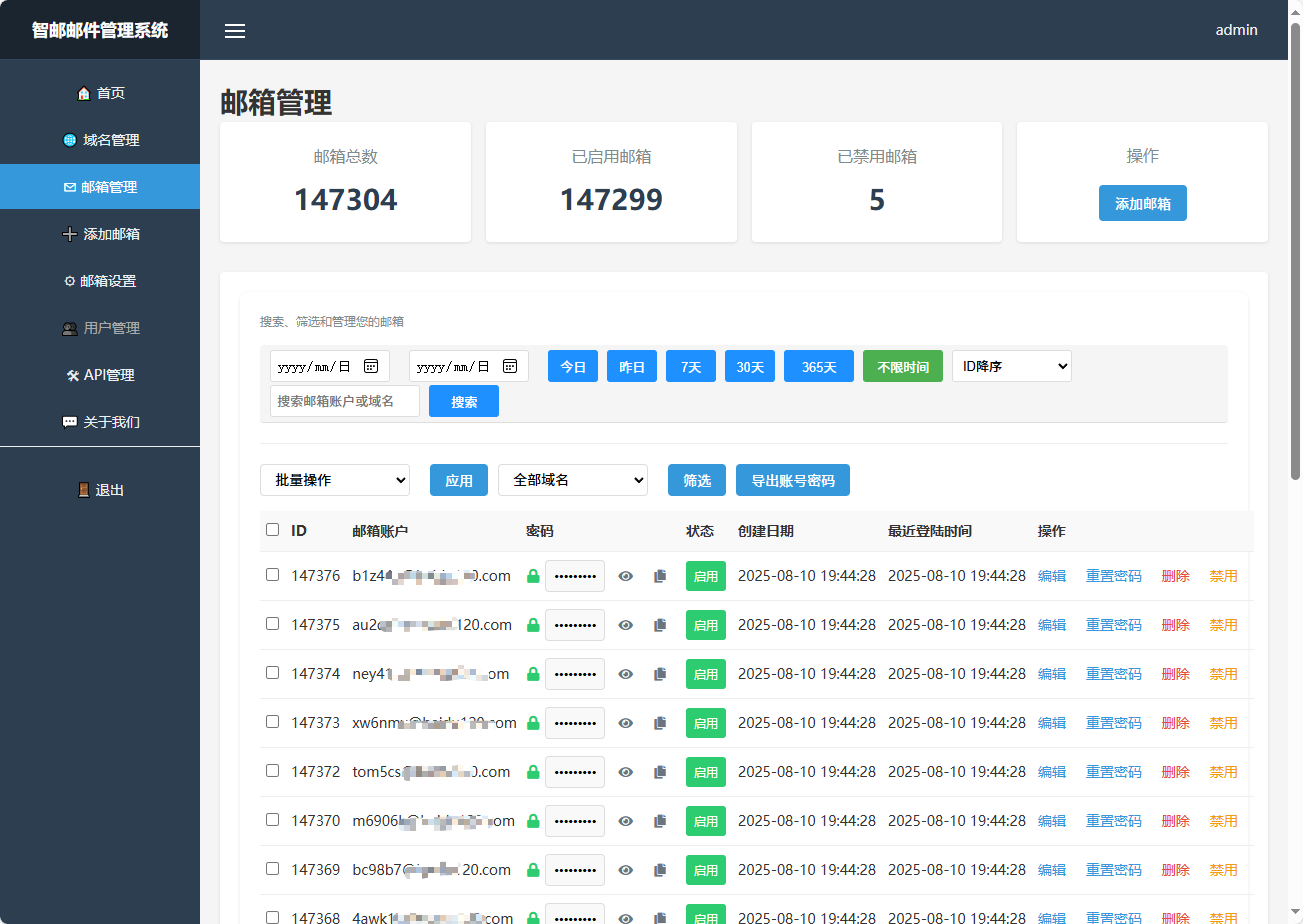 实时统计:显示邮箱总数、启用数、禁用数等关键指标。