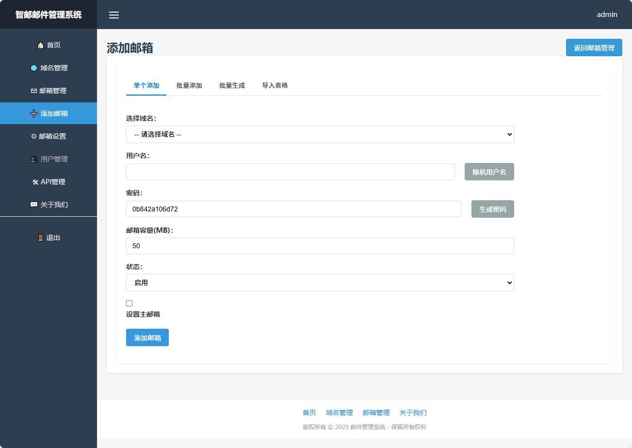 本系统是一套高效、易用、安全的企业级邮箱管理平台,支持大规模邮箱账户的批量管理、导入导出、权限控制和统计分析,适用于企业、学校、服务商等多种场景。二、主要功能